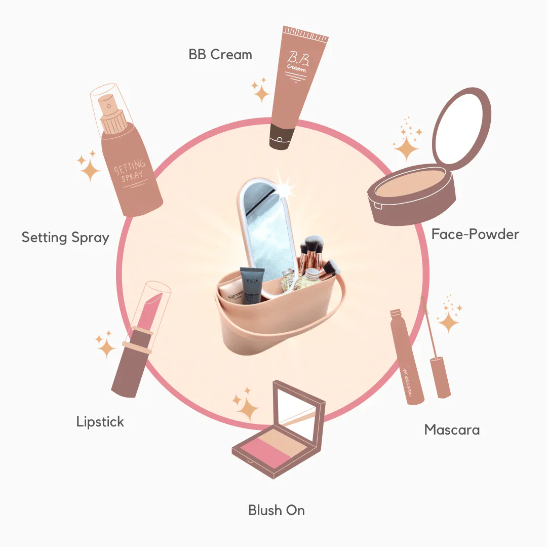 Organisez vos produits de maquillage et de soins préférés dans l'étui verrouillable. Emportez votre Vanityled™ partout où vous allez. Mettez-vous sous les projecteurs et laissez le miroir LED illuminer votre visage pour un maquillage parfait où que vous soyez.